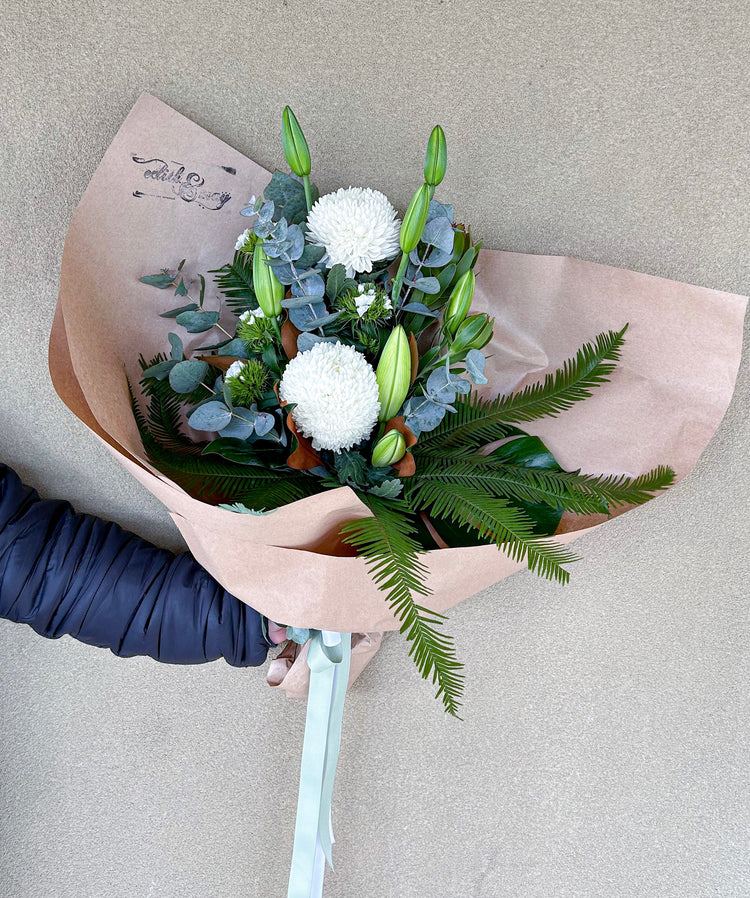 The classic white and green bouquet .. you just can’t go wrong, whether it be for happy, sad, exciting reasons - it covers them all. Picking our best white flowers for the day, these will most likely include Lillies, Chrysanthemums and seasonal varieties such as Sweet William, Alstroemeria or carnations.
