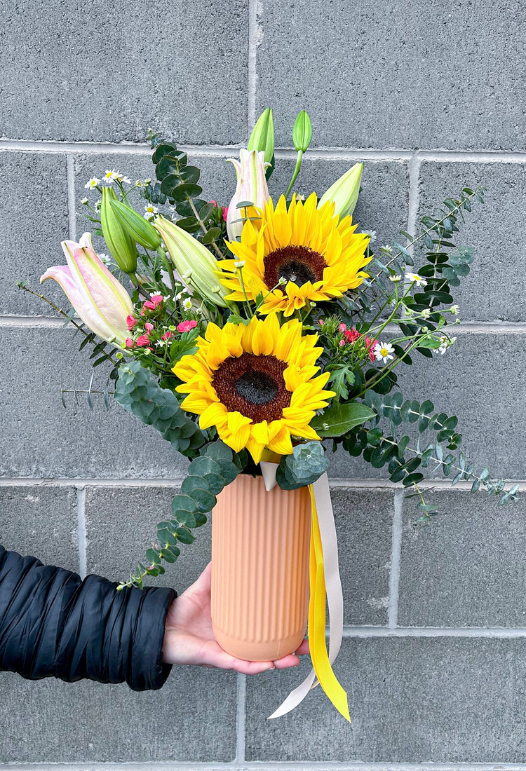 A happy bundle of sunflowers, and other seasonal peaches/apricots into this fab ceramic vase for keeps.