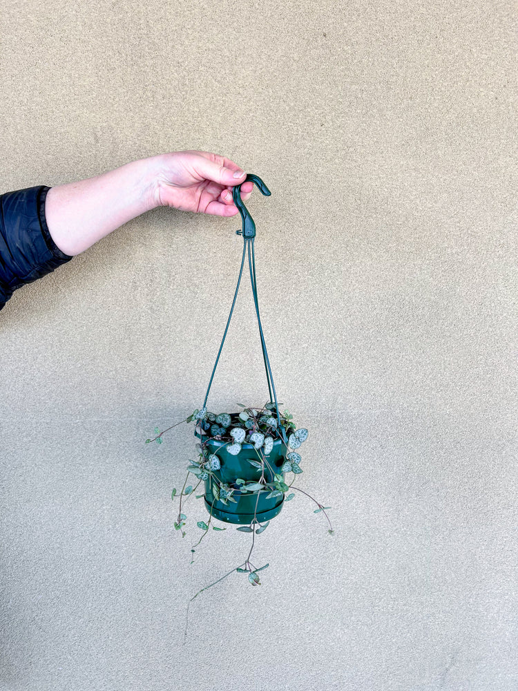 Ceropegia woodii . One of the hardiest of all basket succulents, Hearts can be grown almost anywhere indoors or outdoors, sunny or dark. Long tendrils can grow a metre or more in a season and fill a pot very fast. Heart shaped leaves appear along entire length and cute 3cm vase shaped flowers can appear on summer from every leaf.