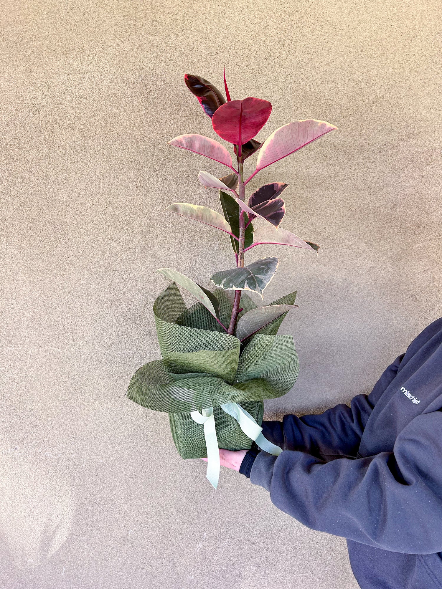 The Ficus elastica Ruby is a hybrid variety of the Ficus elastica with stunning ruby red/pink variegated oval leaves. They grow well in a warm sunny position but doesn’t like the scorching sun. Even though the Ficus elastica is drought tolerant they do prefer humid tropical conditions. Water with moderate amounts of water during the warmer months and only when you notice the soil starting to dry in the colder months.