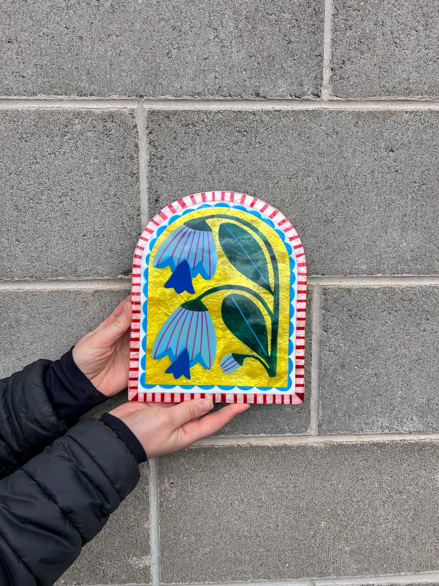 Discover Bloom Nouveau: a premium wall art collection blending Art Nouveau inspiration for a joyful contemporary home aesthetic. Featuring Capiz shell tiles  each piece showcases vibrant hand-painted florals alongside bold graphic patterns. These versatile artworks combine nature-inspired motifs with contemporary designs, creating stunning displays that elevate any space. Mix and match Bloom Nouveau's tiles a to transform your walls into a gallery of eye catching floral elegance.