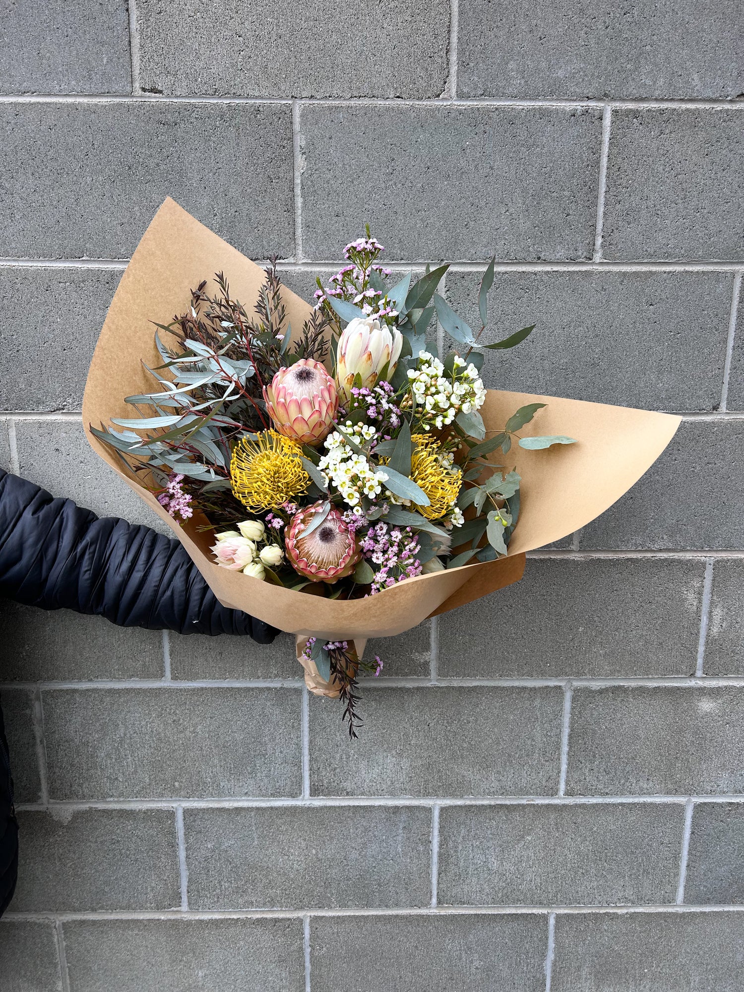 A seasonal selection of the days best native selection. Flowers such as proteas, banksias, leucadendrons, thyrptomene and eucalyptus to bring a little nature to your day.