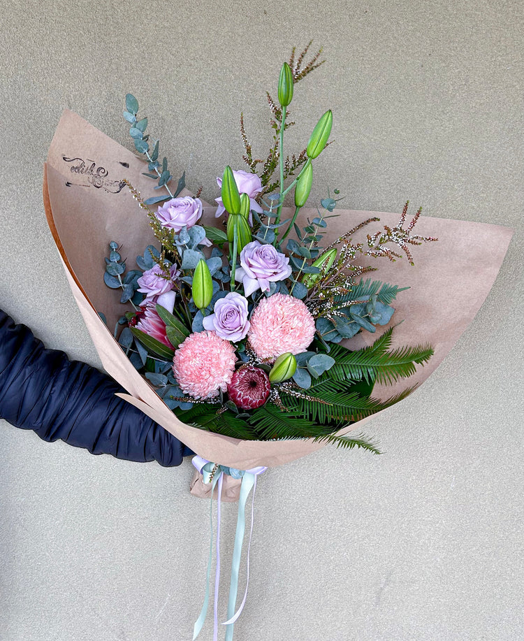 A pretty, seasonal mix of all things pastel. Including flowers such as Lillies, chrysanthemums, roses, proteas or similar depending on what is best of the day.